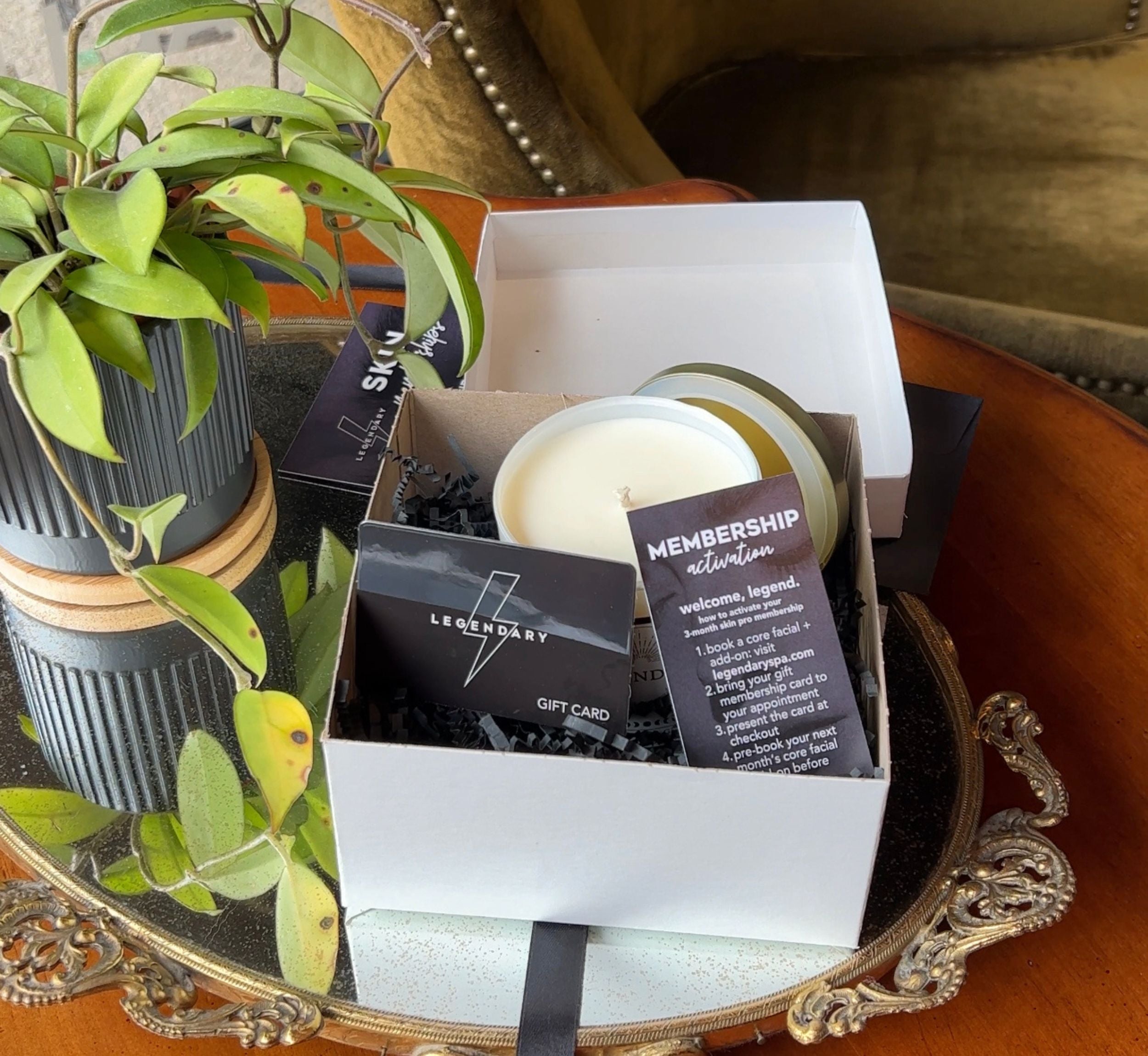 For the most luxe gift, give your loved one a Legendary Membership Box. Each box comes with a handmade candle and a 3-month skin membership (you choose between the Skin Pro and Ultimate Legend). It's already wrapped and ready to go! Available at every Legendary location.